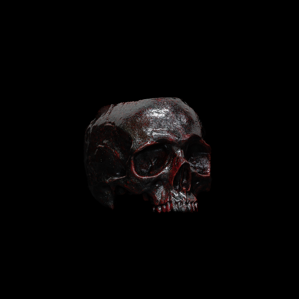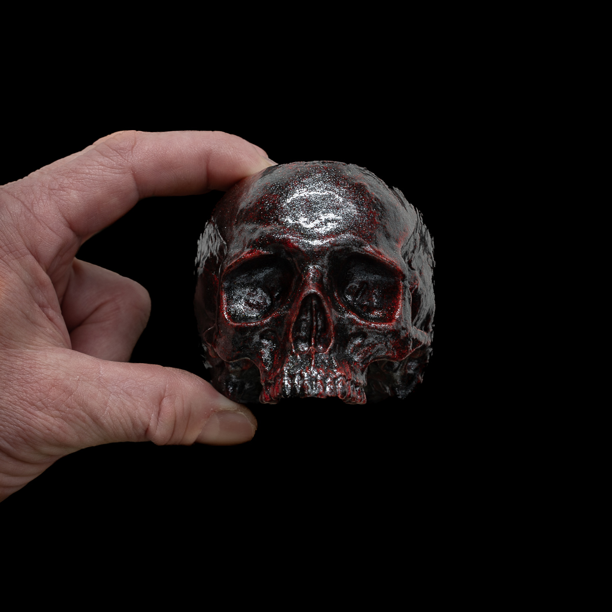 The Bloodstone Skull Espresso Shot Glass features a bright red base with metallic black overlays.